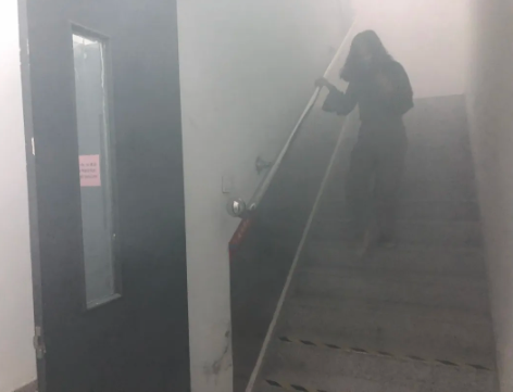 下午16時(shí),消防演練正式開始。隨著火災(zāi)警報(bào)鈴聲響起,樓梯間濃煙彌漫,全體人員在安全員的指揮下用濕毛巾捂住口鼻,彎腰低頭,沿消防通道進(jìn)行緊急疏散。參與演練的人員第一時(shí)間撤離到5號(hào)樓外北側(cè)安全地帶,并進(jìn)行人員清點(diǎn)、確認(rèn)。