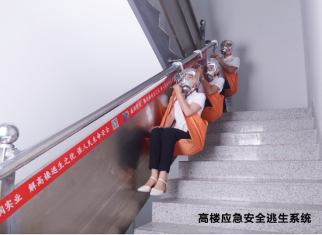 “高樓應(yīng)急安全逃生系統(tǒng)”根據(jù)建筑高的特點,結(jié)合消防救援安全相關(guān)需求,通過改造高層建筑原有樓梯扶手,在火災(zāi)、地震發(fā)生時,被困人員借助扶手懸掛逃生器,通過人體重力,以每秒0.8-1.2米的速度可勻速下滑,起到快速逃生的作用,老弱婦幼等所有人群都可使用。