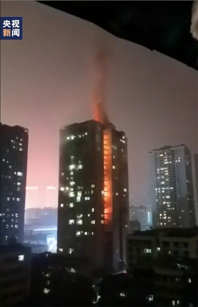 現(xiàn)場畫面顯示,火勢異常兇猛,明火很快貫穿著火點以上樓層,高樓瞬間變成了一個“煙囪”,不斷還有小火星從頂樓往下掉,看起來觸目驚心。初步了解,起火原因是中間樓層的雨棚著火引發(fā)火災,具體情況正在進一步的調查中。