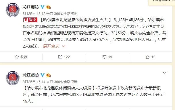 2018年8月25日凌晨4時(shí)40分許,哈爾濱太陽(yáng)島上的北龍溫泉酒店發(fā)生火災(zāi)。截至11時(shí)38分許,相關(guān)部門(mén)正在進(jìn)行清理工作。據(jù)悉,現(xiàn)場(chǎng)已有16具遺體被發(fā)現(xiàn)。