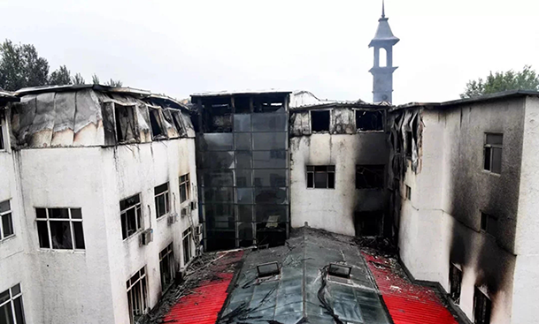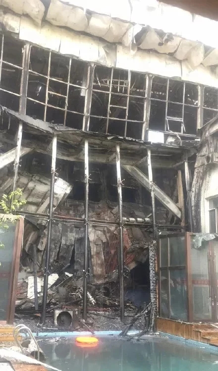 在火災(zāi)現(xiàn)場(chǎng)可以看到,北龍酒店呈“口”字型,除主樓外,配樓也有明顯過(guò)火痕跡,4層樓頂?shù)蔫F皮已經(jīng)變形。