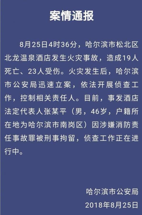 火災(zāi)發(fā)生后,哈爾濱市公安局迅速立案,依法開(kāi)展偵查工作,控制相關(guān)責(zé)任人。目前,事發(fā)酒店法定代表人張某平因涉嫌消防責(zé)任事故罪被刑事拘留,偵查工作正在進(jìn)行中。